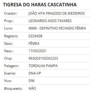 TIGRESA DO HARAS CASCATINHACamilla Correia18 de nov.1 min de leituraPAI: ELFO DO PORTO AZULMÃE: UBA-UBA ELFARNASCIMENTO: 17/03/2021PELAGEM: TORDILHA PAMPA Assista ao(s) vídeo(s)!Entre em contato para informações mais detalhadas e valor!Contato Serginho Barros